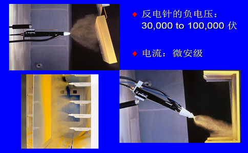 所謂粉末靜電噴涂就是利用高壓靜電電暈電場的原理。在噴槍頭部金屬導流標上接上高壓負極,被噴涂工件接地形成正極,使噴槍和工件之間形成一個較強的靜電電場。