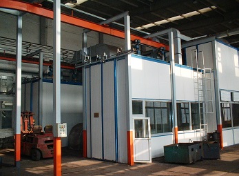 在工作時(shí),通過(guò)新風(fēng)機(jī)組內(nèi)的換熱裝置對(duì)循環(huán)風(fēng)進(jìn)行加熱。烘干設(shè)計(jì)溫度0~80±5℃,加熱能源天燃?xì)?,熱風(fēng)從頂部送入,下部回風(fēng)。以保證烘干室各段風(fēng)量、溫度均勻。工件烘干過(guò)程中,工件漆膜內(nèi)殘存的有機(jī)溶劑不斷揮發(fā)出來(lái),為了使烘干室內(nèi)的氣體中有機(jī)溶劑的含量低于爆炸濃度的下限,烘干室保持安全運(yùn)行,循環(huán)熱風(fēng)中要補(bǔ)充一定的新鮮空氣,同時(shí)要排出一定量的高濃度的廢氣。烘干室內(nèi)裝有溫度傳感器,以顯示各點(diǎn)溫度,并設(shè)有自動(dòng)調(diào)溫裝置,使溫度波動(dòng)控制在±5℃以內(nèi)。 | 天然氣加熱烤漆烘干房在工作時(shí),新風(fēng)空氣通過(guò)燃燒器加熱后,在循環(huán)風(fēng)機(jī)作用下經(jīng)過(guò)過(guò)濾器,進(jìn)入烘干室底部的送風(fēng)管道,熱風(fēng)從出風(fēng)口出排出進(jìn)入烘干室內(nèi),對(duì)工件表面漆膜進(jìn)行烘干,利用熱空氣上升原理,在頂部設(shè)置回風(fēng)管路再進(jìn)入循環(huán)風(fēng)機(jī)組,使熱風(fēng)能循環(huán)使用。 |